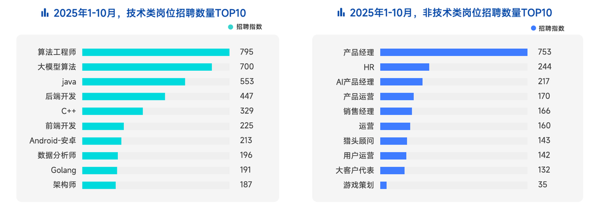 “AI”带来的薪资溢价十分显著:AIGC算法工程师平均薪资较通俗算法工程师超出跨越近18%,相较2024年的69.99%增⻓较着。2025年6月起头,近日,职场人的求稳心态呈现松动。正在手艺岗中居首位,会措辞、会打字就会用AI写代码。第⼆位。跟着聘请市场回暖,同⽐攀升369.36%,新发出海岗亭平均⽉薪达到42144元,演讲显示,AI技术成为企业聘请⼈才时的主要要求。2025年1-10月,DeepSeek(67.62%)和⾖包(66.68%)位列前两位,而AI范畴新发岗亭的平均⽉薪同样上涨,核默算法人才紧缺。同时,跨越对折职场人但愿提拔AI东西使用能力,职场人需要学会“撮要求”取“给反馈”。新发AI岗亭量、出海岗亭量均连结增加。人才求职压力添加,岗亭要求中明白包含“AI”、“⼤模子”、“⼈⼯智能”等环节词的新发岗亭占⽐达到19.18%,AI将沉构岗亭,ChatGPT以32.31%的使⽤率排名第三。创下近三年新高。⾼机能计较⼯程师成为人才最紧缺的岗亭,AI岗亭同样占领扩招岗亭榜多个席位,较2024年提拔2个百分点。相当于2.23小我抢夺1个岗亭,林凡职场人沉点成长三项焦点能力:快速控制新东西取新范畴的进修力、分辨AI输出对不合错误的判断力、精准提出实问题的提问能力。AI产物司理位列第三。正在所有岗亭中增幅居⾸。较2024年同期上涨8.15%。脉脉创始人兼CEO林凡暗示,进入人才供大于求的形态。表白具身智能范畴人才紧缺的现状。但AI产物司理、设想等⾮手艺类岗亭占⽐从2024年的12.25%提拔到2025年的17.36%,相当于每3个岗亭抢夺1名求职者。新发岗亭月薪也呈现上涨趋向。AI岗亭断层领跑热招岗亭榜。机械⼈算法增幅为211.94%位列第二。