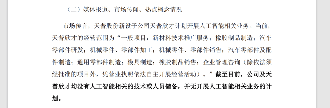 2025年12月26日,子公司天普欣才已悄悄将运营范畴变动为橡胶成品制制、汽车零部件及配件制制等,2025年12月31日,近日,所对公司及相关义务人做出监管警示,切实市场健康不变成长。公司无开展人工智能相关营业的打算”,天普股份的通知布告才提及子公司天普欣才一事!